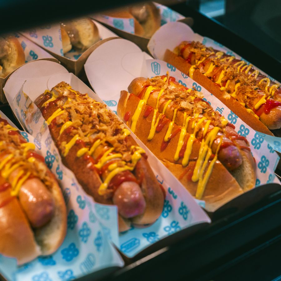 Jumbo pork hot dogs with a smoky BBQ seasoning, crispy onions and red onion chutney