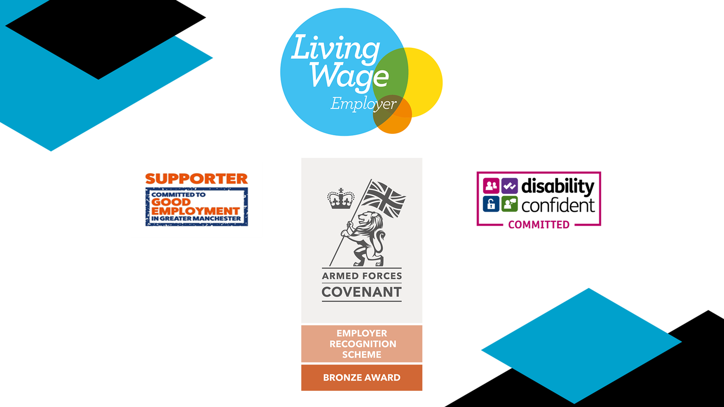 We are proud to partner with leading organisations to create opportunities for everyone. We are delighted to be working alongside Careers Transition Partnership, Forces Friendly, Disability Committed, the Greater Manchester Good Employment Charter, and as a Real Living Wage Employer.